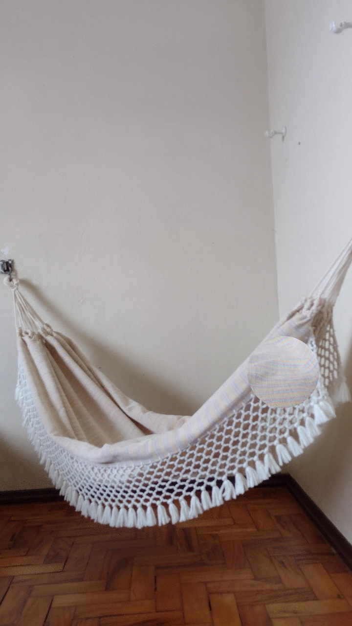 Rede tecida de forma artesanal com fios de algodão comum na cor crua e fios de algodão mercerizado com pequenas listras coloridas, azul, amarelo, lilás e rosa, deixando a rede em tom suave.